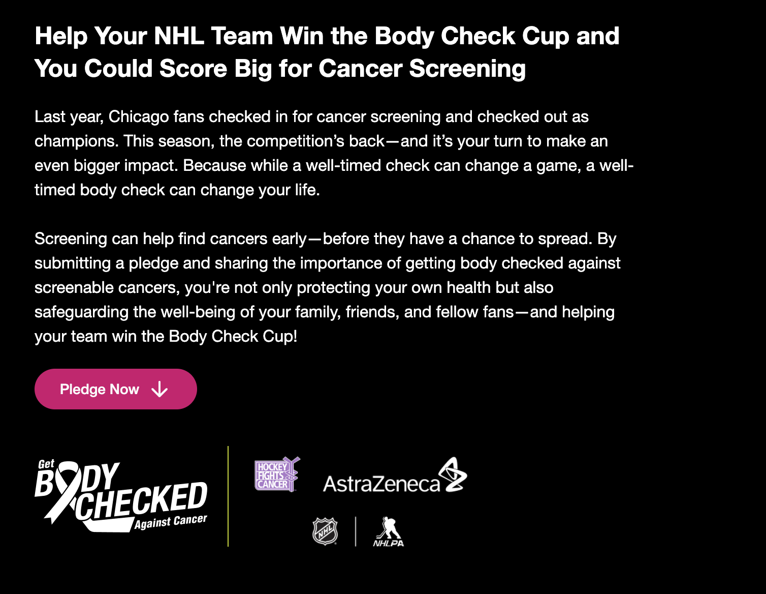 Screening can help find cancers early—before they have a chance to spread. By submitting a pledge and sharing the importance of getting body checked against screenable cancers, you're not only protecting your own health but also safeguarding the well-being of your family, friends, and fellow fans—and helping your team win the Body Check Cup!